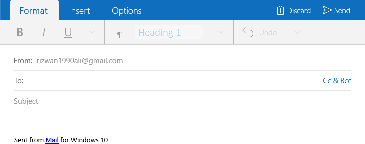 Here we have a taskbar above of it. In that first option is Format. The second is Insert, the third is options. In the Format option, we can select the format for the text, like bold, italic, headings and so on. The second option is Insert. We can insert an image, file, table, link and so on into our composed mail. The last (third) option, Options, is for selecting the language and check the spelling for our composed mail. At the corner of this window, we have the Discard and send a link