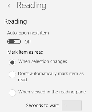 the next option in the Settings is Reading. Here we can manage those emails that are read by us. Here we can select the auto-open property for them. We can also use the marked property, in other words, those emails marked that we read already.