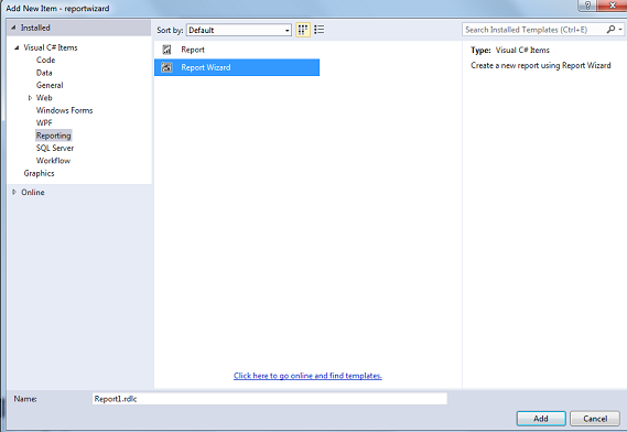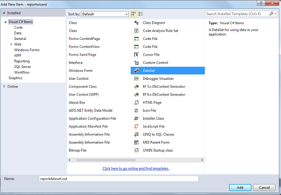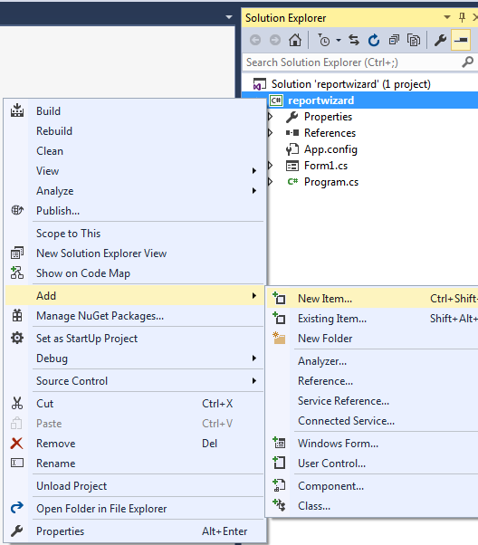 Now we add a Report Wizard into the project. That is simple, go the Solution Explorer, right-click on your project, click on Add New Item then select the reporting in the template field. Now you will see two templates, one is Report and the second is Report Wizard. We select the second one for Report Wizard.