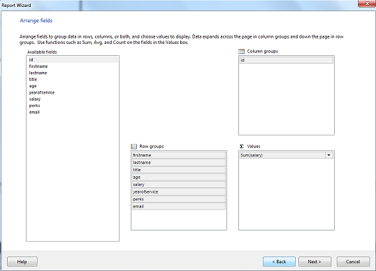 Now simply click on the Next button. You will again get a new popup window. In that window you manage the columns and rows for your report that you want to show in the report.