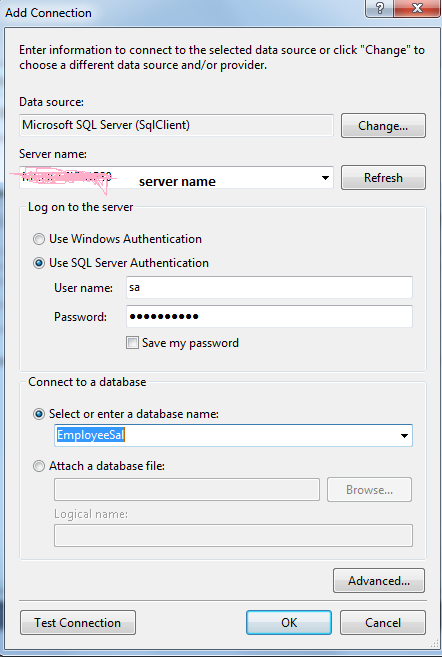 Click on the New Connection Button then again a window is shown. In this window fill in the server name. From the radio button select the "use SQL Server Authentication" option. Now insert your user name and password then from the drop down list select that database name that you want to use in your report.