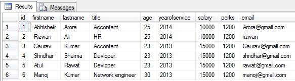 - insert into employee values(6,'Manoj','Kumar','Network engineer',30,2013,15000,1200,'[email protected]')