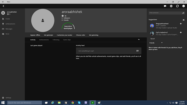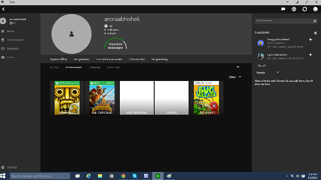 Now you have successfully logged into Xbox using Windows 10. Here you have a panel with your name. In this panel you have various options, like invite a friend, add a friend, what your reputation is as a player, which games you played in the past and many more. This panel gives you all the links that are needed for any user. In this panel, you also have some tabs that do not work because Microsoft is doing work on them very quickly. So when you click on those tabs then get the message "Coming Soon".