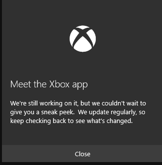 Now again go the Start button of your Window 10, click on the Xbox and enter your user id and password. Now you have a pop-up window like this. This pop-up has an option to close so close this pop-up.