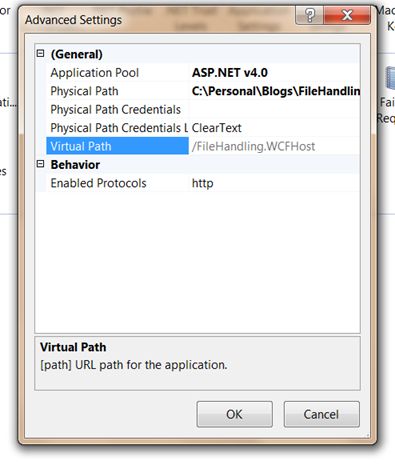 - Right-click the FileHandling.WCFHost project in Visual Studio and go to the properties. Under the Web tab click on “Use local IIS WebServer” and under the Project URL, write “http://localhost/FileHandling.WCFHost” and click on the button “Create Virtual Directory”. This will create a Virtual Directory for FileHandling.WCFHost in IIS.