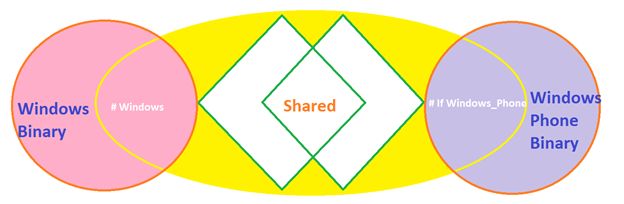For Windows 8 two binaries, for Windows and Windows Phone, are generated with a shared project and we can code based on a condition, a compilation constant, that we can also switch for either Windows or Windows Phone at design time and it automatically refers to the respective ADKs whenever the context switches, of course using Intellisense.