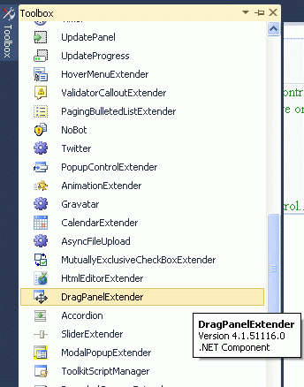 Step 3 : Go to the ToolBox and add the DragPanelExtender control to the form.