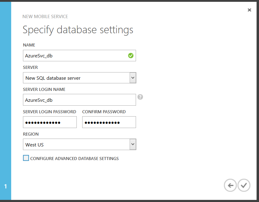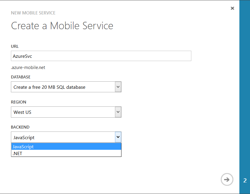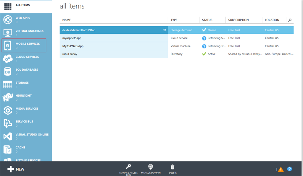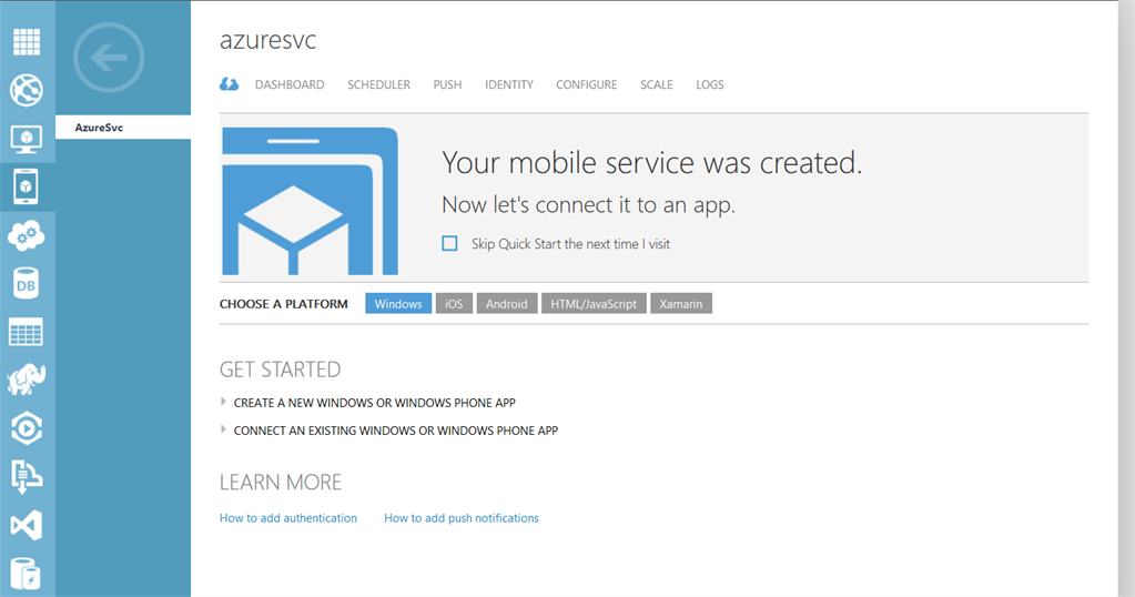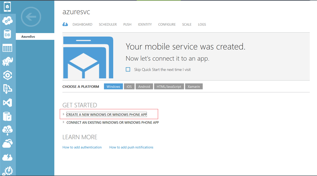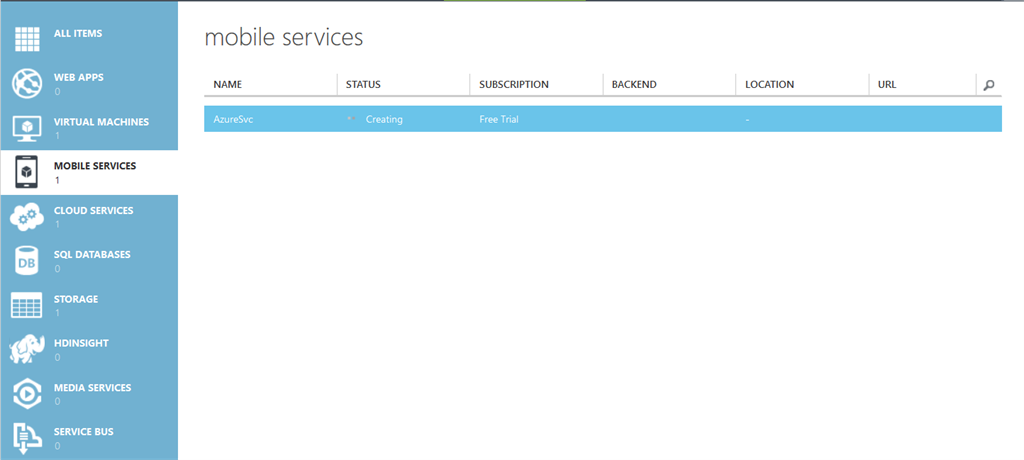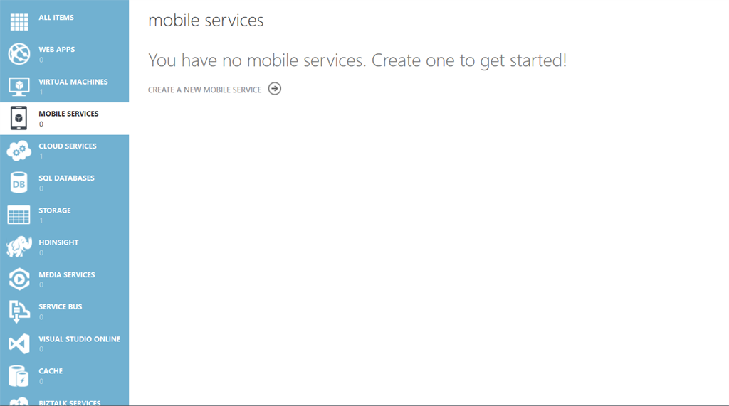 Wherein I currently do not have a mobile service created. I'll go ahead and create this link as shown below and create a new mobile service.