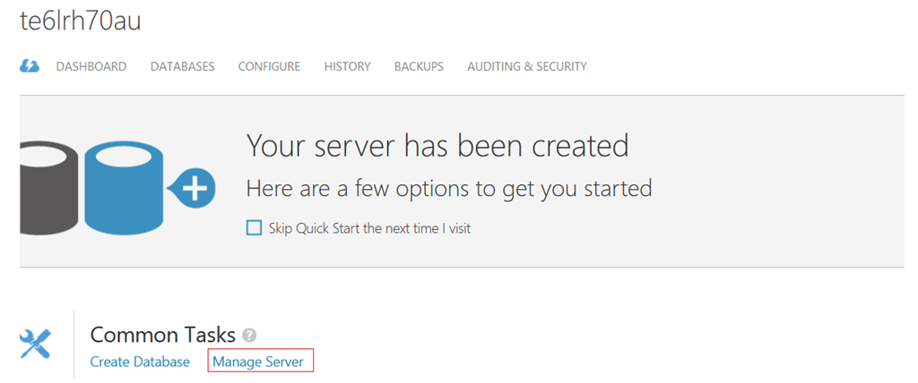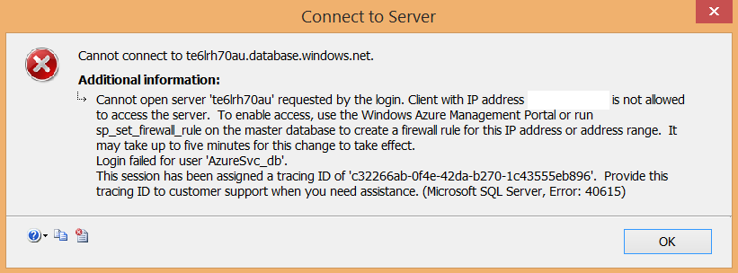 To fix it, you can go back to the Azure Portal and click on Manage Server and include your IP in the trusted IP List.