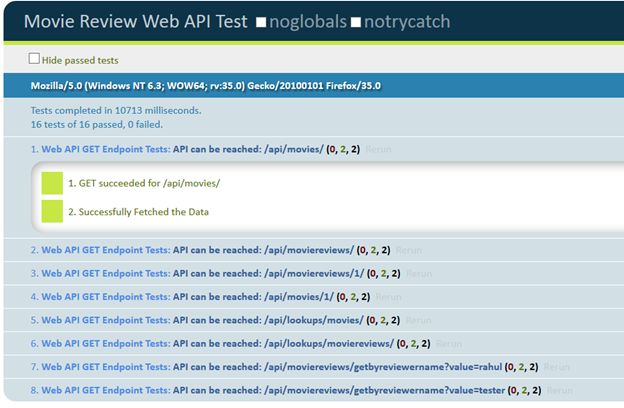Similarly various endpoints can be tested. Apart from Web API tests, I have also used Jasmine to test my Angular code. You will also learn how to test client-side JavaScript code with Visual Studio. Here, I have used Chutzpah to integrate JavaScript Tests with Visual Studio. The following is a glimpse of it.