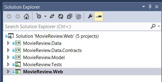 Here, the highlighted one is the web project that is dependent on the other infrastructure projects Data, Contracts and Model. The Data project is the place to maintain the initial seed data, Entity Framework DBContext and many more things involved in the direct interfacing down the layer with database. The Data Contract is the to manage your repositories and apply the Unit of Work Pattern on the repositories like movies and moviereviews. Model is the place where you will be having your Plain Old CLR Objects (POCOs). This is where you are maintaining all the properties attributed to the tables. The following is a glimpse of all the projects in their expanded form.