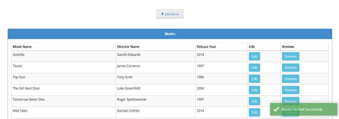 Once, the page is loaded, a little toast message at the bottom-right of the screen pops up saying Movies Fetched Successfully. Now, from this screen you can do all the CRUD operations. Here the very first link is Add Movie that will provide the user the flexibility to go ahead and add a new movie as shown below.