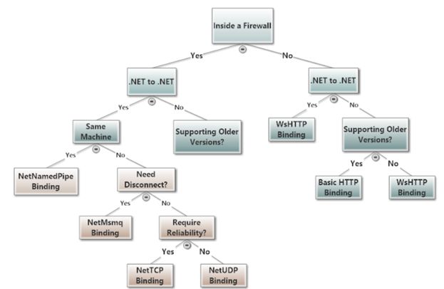 However, if you are inside the firewall and a client is not .Net to .Net, then you can ask the Supporting Older Version question. And if it's a .Net client and inside the Firewall, then the next question is if it exists in the same machine, or in other words is it a local in-process only? If so then you can use NetNamedPipeBinding. And if the client is not on the same machine and it's more conventional, like a server on one machine and the client is on other, then the next question I would ask is whether you need to disconnect. If the answer is yes, then you should use NetMSMQBinding. If the answer is no, then the next question I would ask is whether you need reliability. Now, if you don't require reliability then you can use NetUDPBinding otherwise NetTcpBinding. So, these are the most common use cases of choosing a binding.