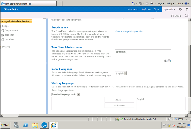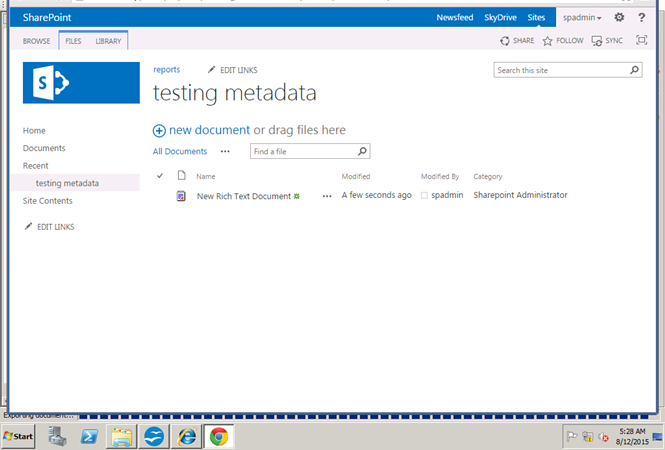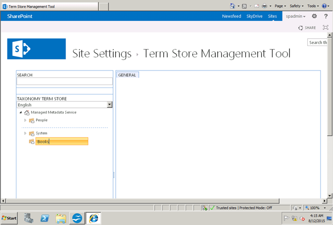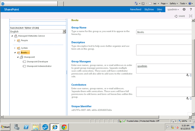 On this window, enter the name of the service application.Enter the database name.I am using WSS_Metadata_Service_App.Create a new application pool “Metadata_Apppool”.The configurable account will be “CRAZYSHAREPOINT\Spfarm”.Click OK to complete.Now see that the Managed metadata service application has been configured successfully.Click on managed metadata service application.Add users under term store administrators and grant a permission to create a term and term sets.Added CRAZYSHAREPOINT\Spadmin.Click Save.Click on New Group.Create a group named books.Click under the new group to create a new term set.Enter SPAdmin as a group manager permissions.Now I will create a new term set under books.Create a new group named “Books".Create a term set named “Sharepoint'.Create a terms.SharePoint DeveloperSharePoint AdministratorNow open a team site.Create a Document Library.Create a new column named Category → Column type: Managed Metadata.Select your term set.Now your Document Library looks like this.Now upload a new document.Click Save.Now the new terms have been added to the documents.Happy SharePointRegards: Vinodh.N(Sharepoint Developer\Administrator).