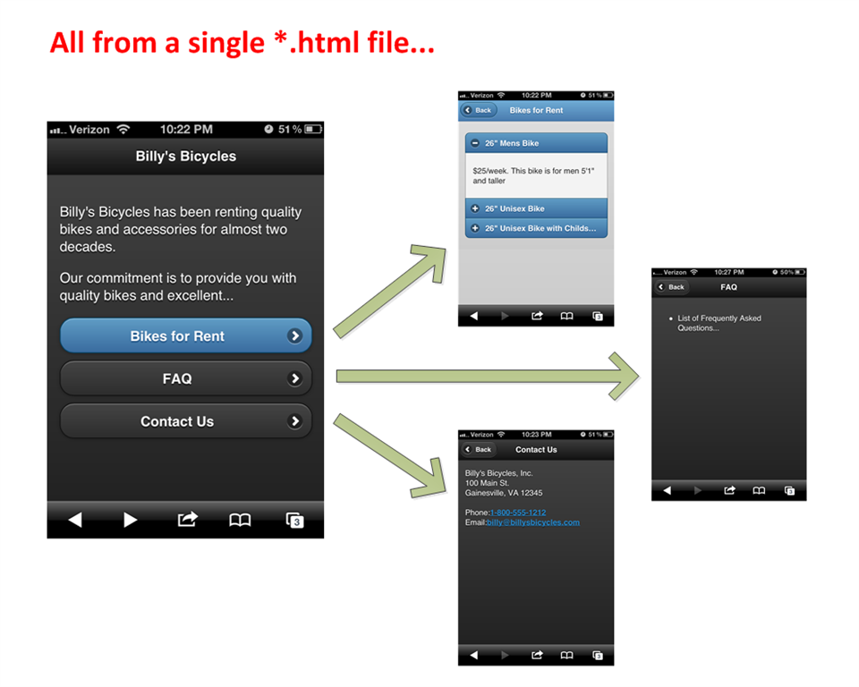 - jQuery Mobile provides a navigation framework that allows multiple screens to be embedded in a single HTML web page.