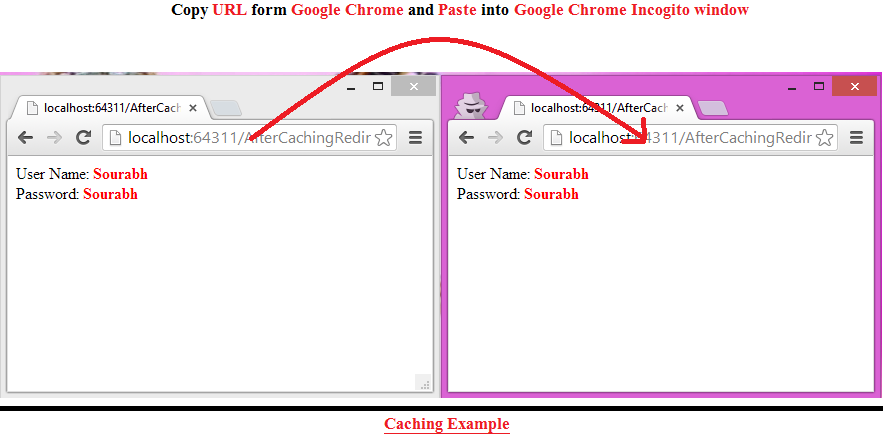 Code above is describes that I am saving username and password on the server's cache memory, and after storing the username and password inside the server cache page will be redirect to the AfterCahchingRedirect.aspx