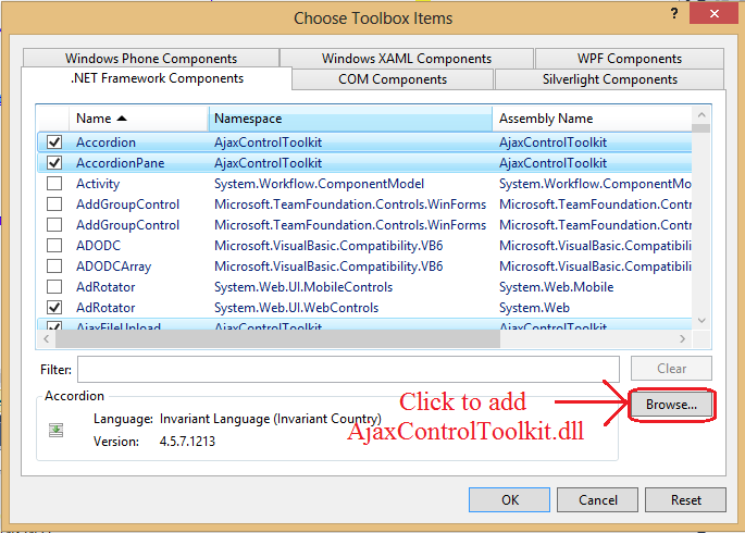 Now one window will open, click on "Browse" and go to where the AjaxToolKit is available and add the "AjaxControlToolkit.dll" file, then click on the "OK" button.