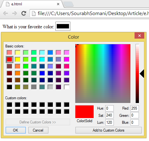 The color input type is quite self-explanatory, it allows users to select the color; when the user selects a color then it returns the hex value of the color. This color input type is the same as a color picker; by using this we can pick the color.