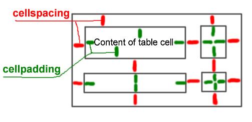 Cellpadding and Cellspacing Attribute of a table: Using cellspacing you can set the space between cells and of the table and by using cellpadding you can set the space between cells the border and cell contents.