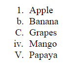 - <li type="I">Papaya</li>