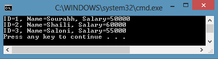 Console.WriteLine("ID={0}, Name={1}, Salary={2}", c.EmpID, c.EmpName, c.EmpSalary);