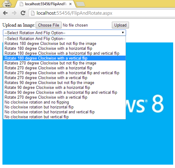 This article explains image rotation and flipping using ASP.NET. Image rotation and flipping is also called mirror image. This article will tell you about the RotateFlipType Enumerator of the System.Drawing namespace. The rotation and flipping operation can be done using Enum values that are available inside the System.Drawing Namespace.