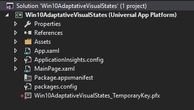 Where you will see some changes are actually in the project structure after creating a new blank application project. If you take a look at the project in the Solution Explorer panel, you should find the structure isn't the same as with the "universal apps" for Windows 8.1 and Windows Phone 8.1 with a platform-specific project for each target + a shared project: