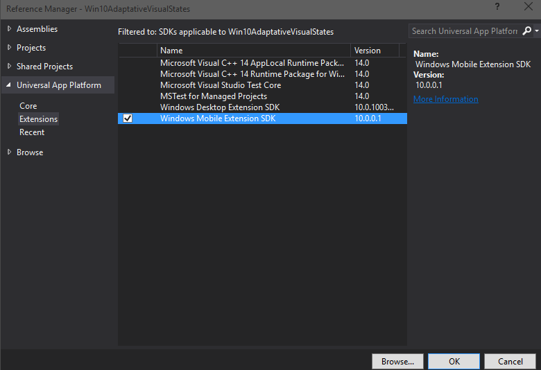 Having one project for all device families, how can you use a feature included in one type of device? Microsoft resolved this using an "Extensions SDK". When you first create a new blank application project, everything you have access to is the core shared functionality across all device families. If you need to access a phone-related feature, you need to add the phone, or mobile using the new naming and extension SDK. If you need desktop features, do the same with the desktop extension SDK. To see all the available SDKs, right-click the project references then select References Manager > Universal App Platform > Extensions as in the following.