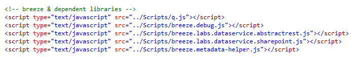 The code of the preceding content needs a lot amount of time and patience. As an alternate, Breezejs can be used to simplify the formatting and submission of data. We need to reference Breeze libraries in the SharePoint App Page. The following is the reference for that.