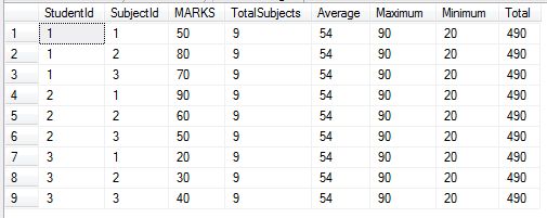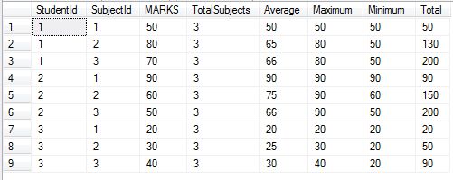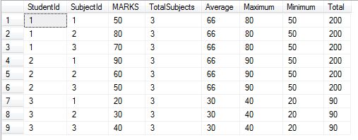 As you can see above, the average, maximum, minimum and total is done based upon student id, in other words we are getting Average, Maximum, Minimum and total for every student in his/her subjects.