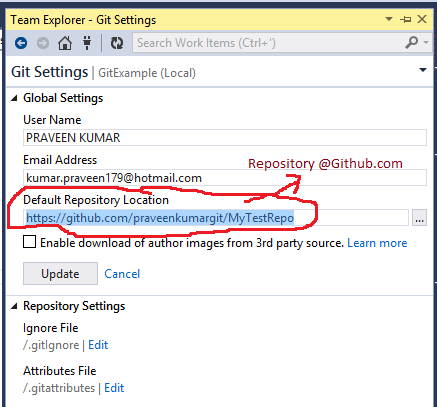 Now we have created our application that can work under the Git Version Control environment but some additional settings still need to be configured. To configure the application go to Team Explorer in Visual Studio and configure the setting by providing Username, Email Address and Repository Location. Where Repository is the place on the server/local where the history of our work is stored.