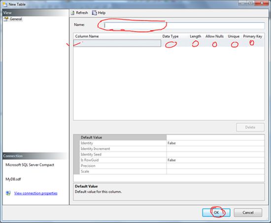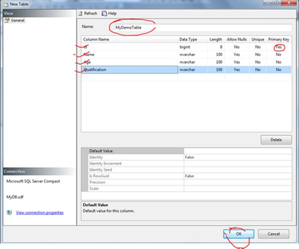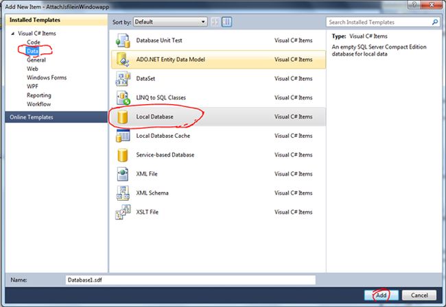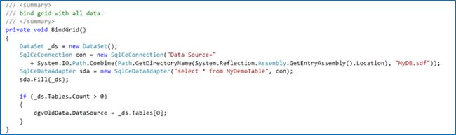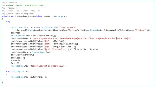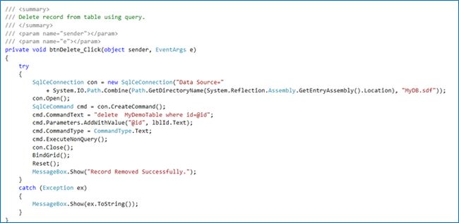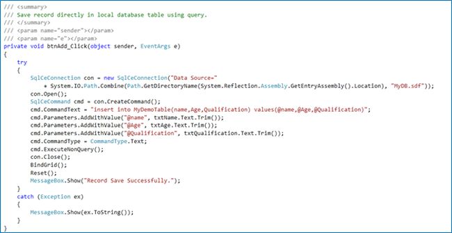 Step 1: How to add a SDF file to an application(a) Execute Solution Explorer then right-click on your application then select "Add" -> "New Item".(b) Go to "Data" -> "Local database" then click on the "Add" button.(c) Then go to the "View" menu and select "Server Explorer".Here you can see the local database you created.Step 2: How to create a table in a SDF Database(a) Then go to the Server Explorer then expand your database ("MyDB.sdf") then right-click on "Table" then select "Create Table".(b) Write your table name and add a column name, column data type, length and so on and click "OK".In this screen are my table name and my column name. Step 3: How to save data in a SDF database table using queryWith this code:Step 4: How to update data in a SDF database table using a queryWrite this code:Step 5: How to delete data from a local database (.sdf) table using queryWrite this code:Bind GridThis is my complete demo. Please download the attachment for the complete demo.