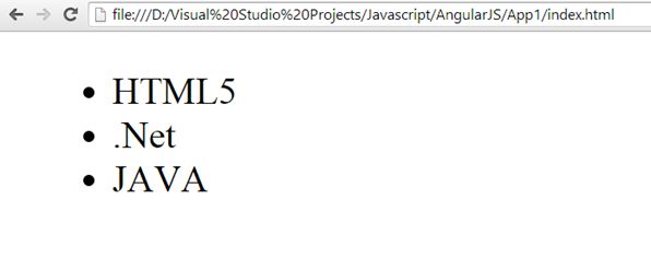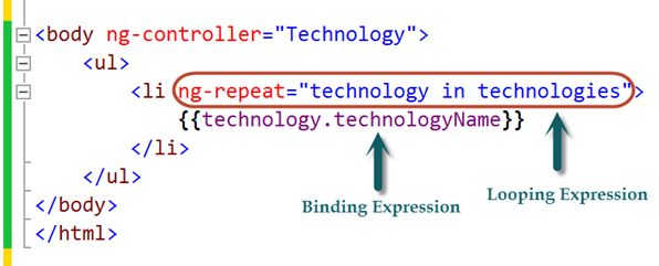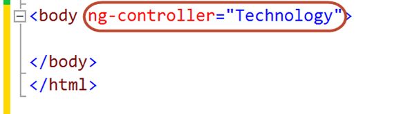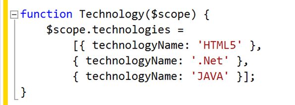 If you look closely, we have defined a collection technologies, in the $scope object, that can be accessed from the View (HTML) directly. Since it's an array we need to loop though in order to display it on the screen.