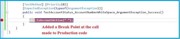 Let's refactor our production or development code to make the TestAccountStatus_ArgumentException_Success() test case pass. The new code additions are highlighted in Green.