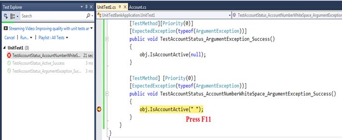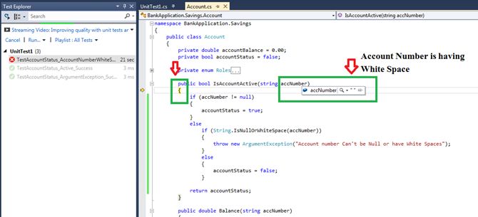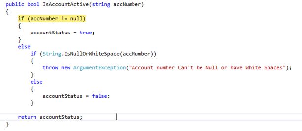 So what we discovered is that the first condition accNumber!= null is true even if WhiteSpace has been passed as the account number. Hence, it's another opportunity to refactor the production code and re-run the Test(s). The new code additions are: