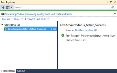 Scenario #1: To test this production code we add [TestMethod] TestAccountStatus_Active_Success() to our TDD Suite (Unit Test Project).
