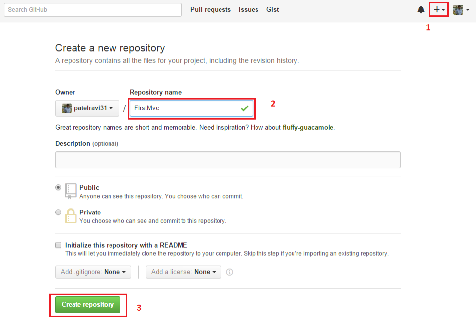 Step 4: Now login into your GitHub account , after login just see the left side of your profile photo and click on + symbol. Then click on create new repository,  give any name here. I have given FirstMvc.