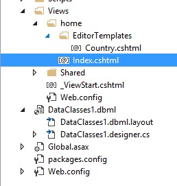 First we create an Editor Template inside the View folder and EditorTemplate contained in the Country.cshtml file. The file name is the same as the model name and the Country.cshtml file contains the following code.