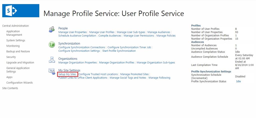 After doing this, the Manage Profile Service: User Profile Service page will display on your screen. Then click on Setup My Sites inside My Site Settings.
