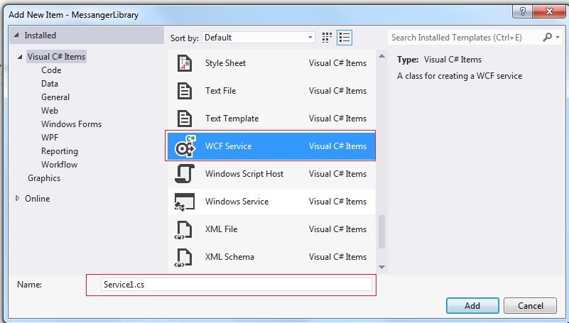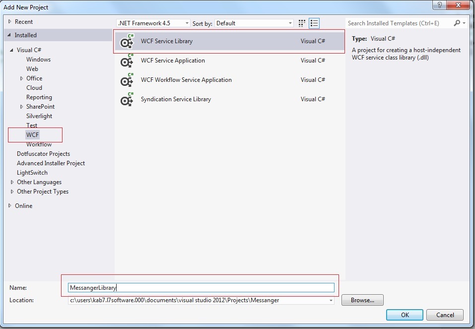 Add another project by right-clicking the main project. Select WCF Template from the left pane then select WCF Service Library from the right pane then rename the project to MessangerLibrary.
