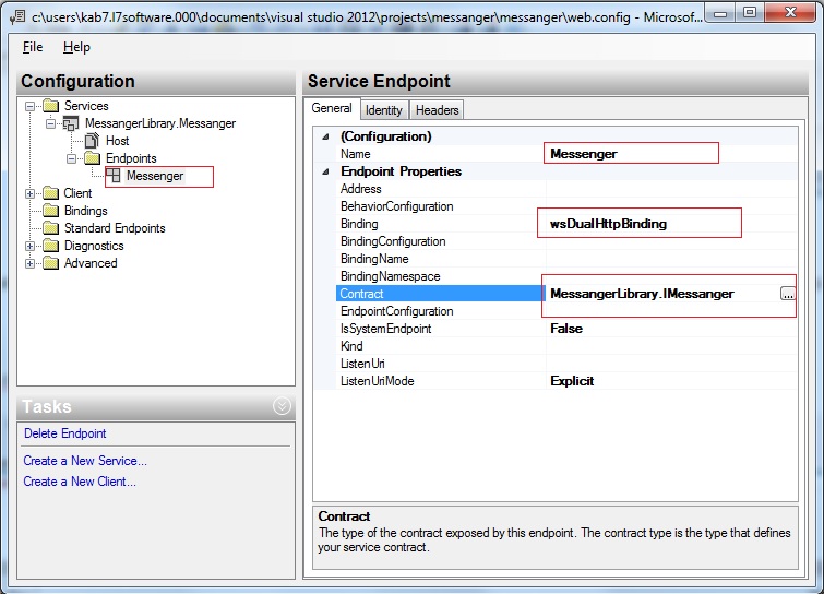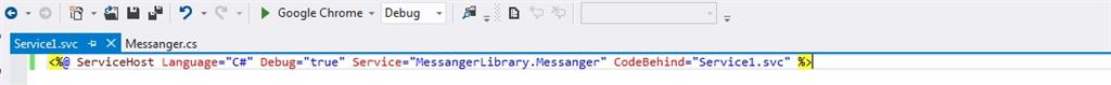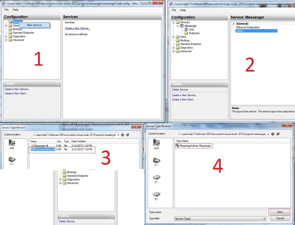 Right-click on the Web.config file of Messanger and select Edit WCF Configuration. The following window will open (as in Image 1). Right-click on the Service and select New Service menu. at the right pane click on the button marked in Image 2. The service type browser window will open (as in Image 3). Select the Messanger Library and click the Open button then select the messanger service (Image-4).