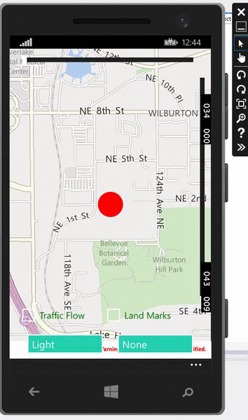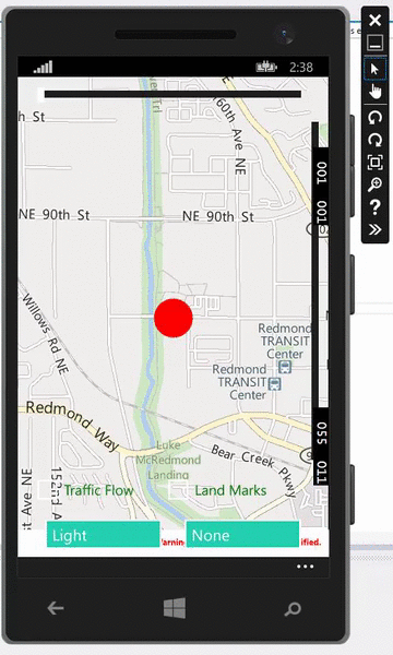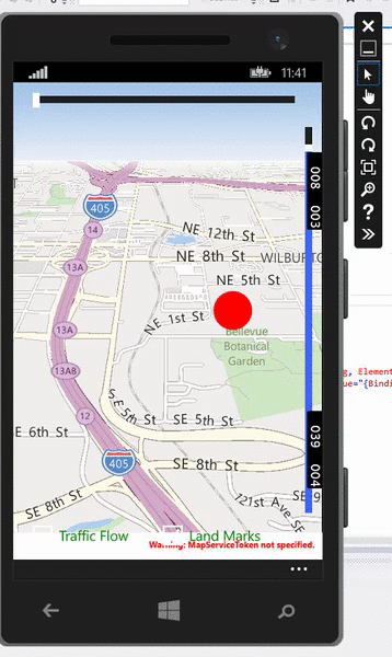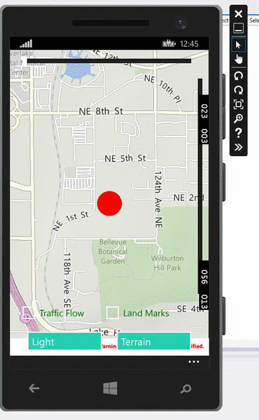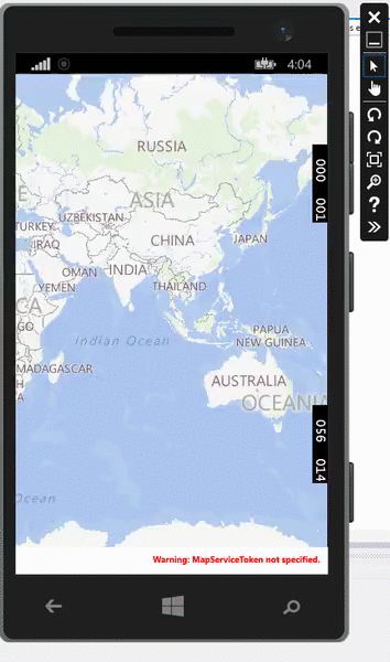 The map control itself comes with many properties equipped, let's see how to change these for a chance. The first two things we'd love to change is the pitch/tilt and the rotation/heading. For that we'd need to change our layout a bit. Let's keep the map in the background and put 2 sliders (one horizontal and one vertical) for changing the rotation and pitch of the map.