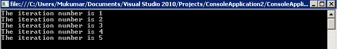 Here is an example of a for statement that loops through a block of code five times, and each time, it prints a string "The iteration number is" with the count value to the console. In this code, int i=1; is a declaration of a local variable that will participate throughout the loop.The i<=5; is the condition that decides how often iteration will continue.