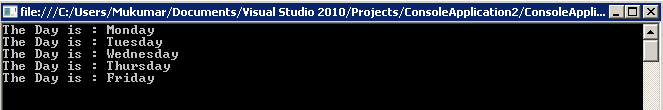 Here's an example of a foreach statement in C# that iterates over an array of strings and prints each element of the array. The string array daysofWeek has five elements.
