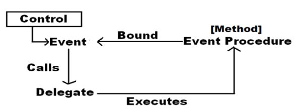 Because a delegate is responsible for execution of the event procedure, first the event, the delegate and the event procedure will be bound with each other as in the following: