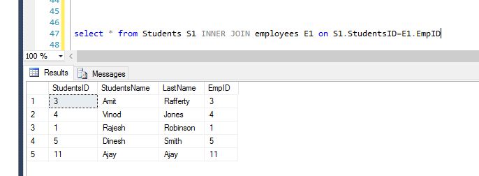 Join means combining fields from two or more tables by having common values in each relational database table. SQL INNER JOIN is the most common and a simple join used mostly. Find a detailed article about Joins in SQL Server here: Joins in SQL Server