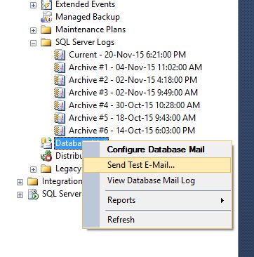 Step 1: Click on Management in your SQL Server Object Explorer, the click on SQL Server Logs. After that click Configure Database Mail as in the following screenshot,