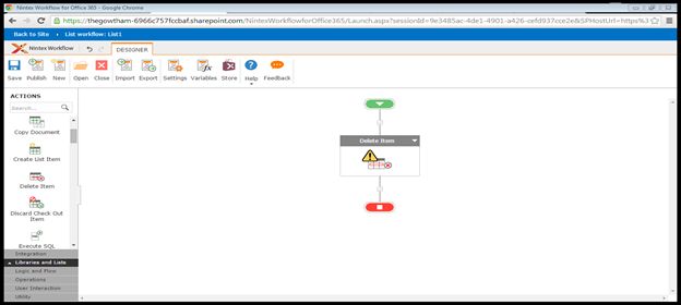 Next drag the Delete list item action to the Nintex page. Your workflow should be like this, you might be seeing an exclamatory mark as a warning because it is yet not configured. Once we configure it, the notification is turned off.