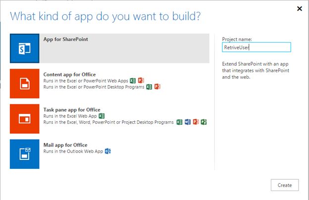 - Choose the App for SharePoint template, name the project Create Site and then choose the Create button.