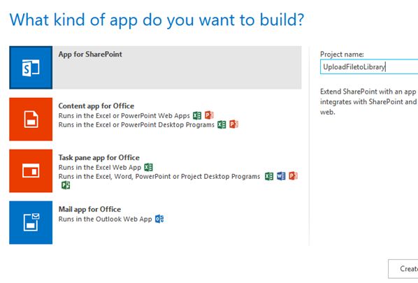 - Choose the App for SharePoint template, name the project. Create the site and then choose the Create button.